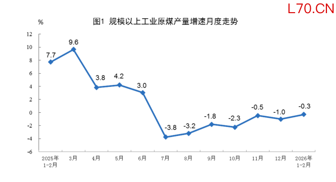 国家统计局:1—2月份,规上工业原煤产量同比下降0.3%