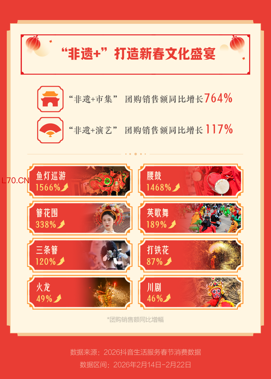 2月23日,抖音生活服务发布2026年春节消费数据。2月14日至2月22日,在“团圆欢聚”与“文旅过年”热潮带动下,非遗体验、餐饮堂食、休闲娱乐、异地住宿、民俗旅游、运动健身等多类消费迎来显著增长。数据显示,与去年春节同期相比,今年春节期间抖音团圆饭套餐订单量增长216%,“非遗+市集”团购销售额增长高达764%,三线及以下城市团购销售额增长66%,新春消费市场呈现出多元升级、全域火热的新态势。