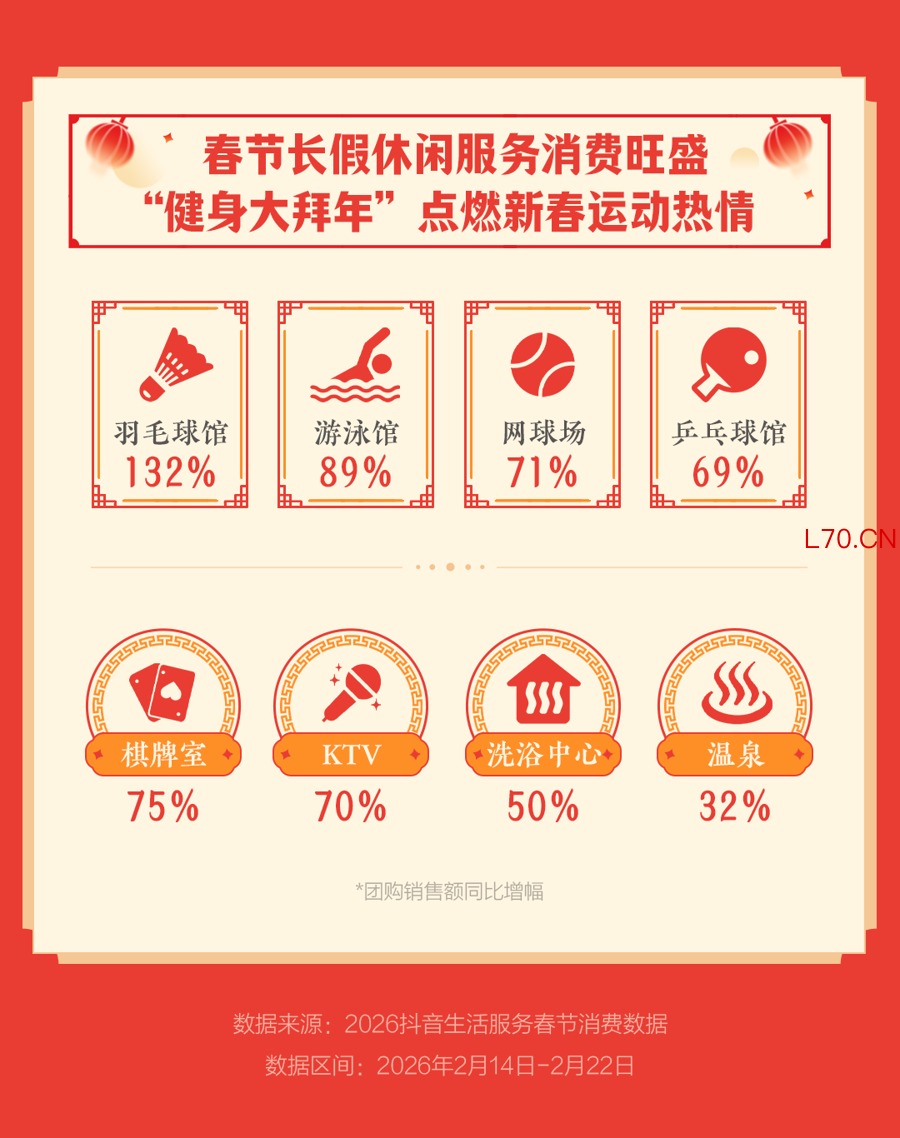 同时,休闲消费与品质消费同步升级。数据显示,春节期间足疗按摩、商超购物券、黄金、灯会庙会等品类团购订单量涨幅也均超60%。长假期间,“健身大拜年”点燃新春运动热情,羽毛球馆、游泳馆、网球场、乒乓球馆团购销售额同比分别增长132%、89%、71%和69%。棋牌室、KTV、洗浴中心、温泉等休闲娱乐场所的销售额也分别增长了75%、70%、50%和32%。购物休闲与运动健身相结合,不断丰富大众欢度新春的消费选择。
