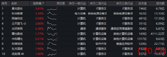 成份股方面,紫光股份、科华数据领涨超3%,网宿科技、云天励飞-U、光环新网、中科曙光涨逾2%,曙光数创、拓维信息等个股跟涨。