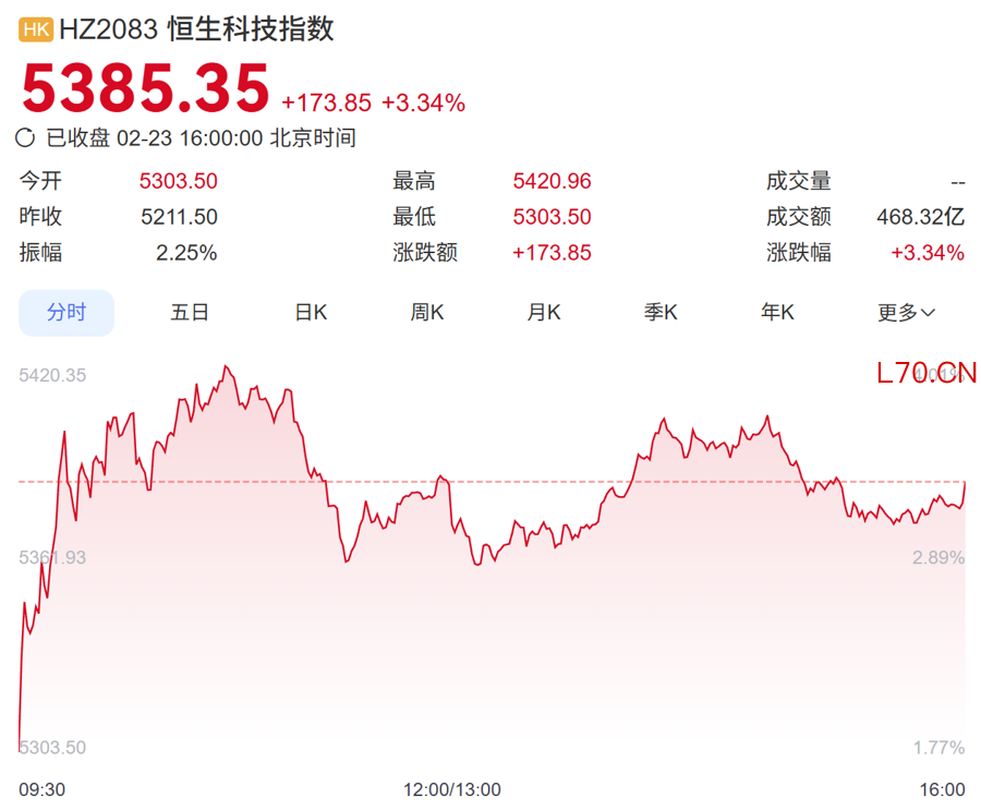 2月23日,马年港股第二个交易日,恒生指数大涨2.53%。虽然前一交易日大涨的大模型企业智谱、MiniMax大幅下挫,但市场热度仍然离不开“科技”二字,半导体、互联网等科技股票走高,带动恒生科技指数涨超3%。